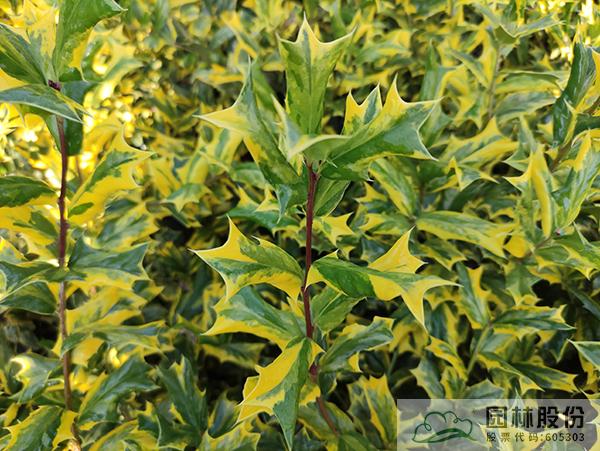 花葉枸骨Ilex cornuta 'O Spring':它的母本是我國最為常見的的枸骨,經(jīng)常在溝壑、丘陵和山路旁發(fā)現(xiàn)其存在。由俄克拉荷馬州的一名苗圃工人Otto Spring發(fā)現(xiàn)的變異。常綠灌木或小喬木,屬于雄性植株。葉厚革質(zhì),有光澤,葉形呈四角狀長圓形,葉緣常反曲,在春季,葉緣呈現(xiàn)黃油色調(diào),到了秋冬季則會(huì)變成金黃色,莖稈也會(huì)變成紫色。適合種植在庭院、公園、街道等地方,可以作為綠籬植物使用,也可以修剪成小樹的形狀。對(duì)土壤適應(yīng)性較強(qiáng),幾乎可以在任何土壤中生長,而且具有耐干旱和高溫的特性。因此,它是一種簡單耐用的冬青品種。