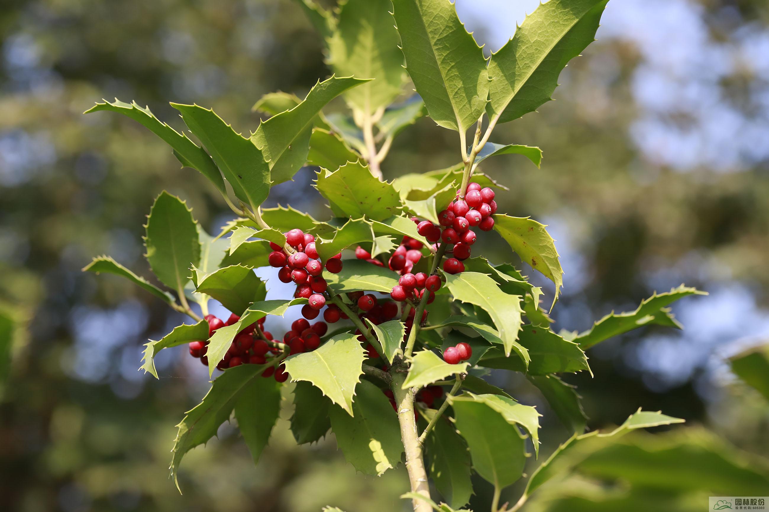 本品種為品種阿拉斯加Ilex aquifolium 'Alaska'種子繁育的實生苗中選育而得。常綠喬木,雌株,植株圓錐狀,幼枝褐紅色。幼葉紅褐色,老葉綠色。葉片厚革質(zhì),矩圓形,葉緣波狀起伏,密布中等深度的小刺齒?;ㄆ?月中上旬,雌花黃綠色。果紅色,掛果期為10中下旬至11月中上旬。
